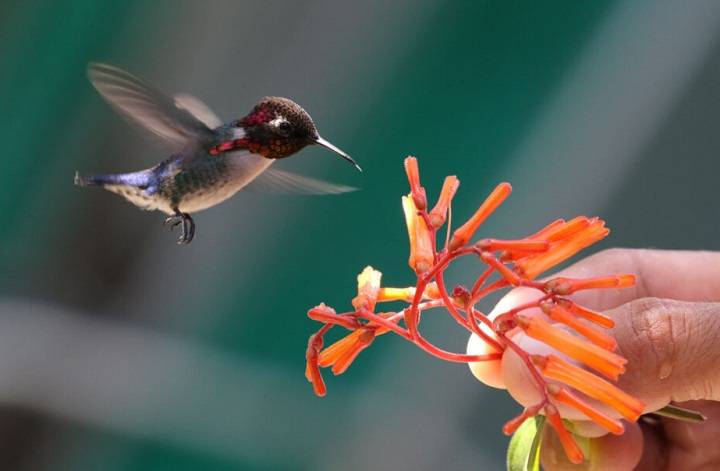 The smallest bird in the world - a Bee Hummingbird - drinks nectar from a plant held by a person. Taken in a Hummingbird Garden near Playa Larga, Cuba
